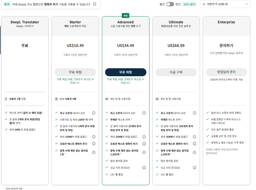 | Advanced | $34.49/월 | 텍스트 무제한, 문서 20개, 용어집 2000개 |