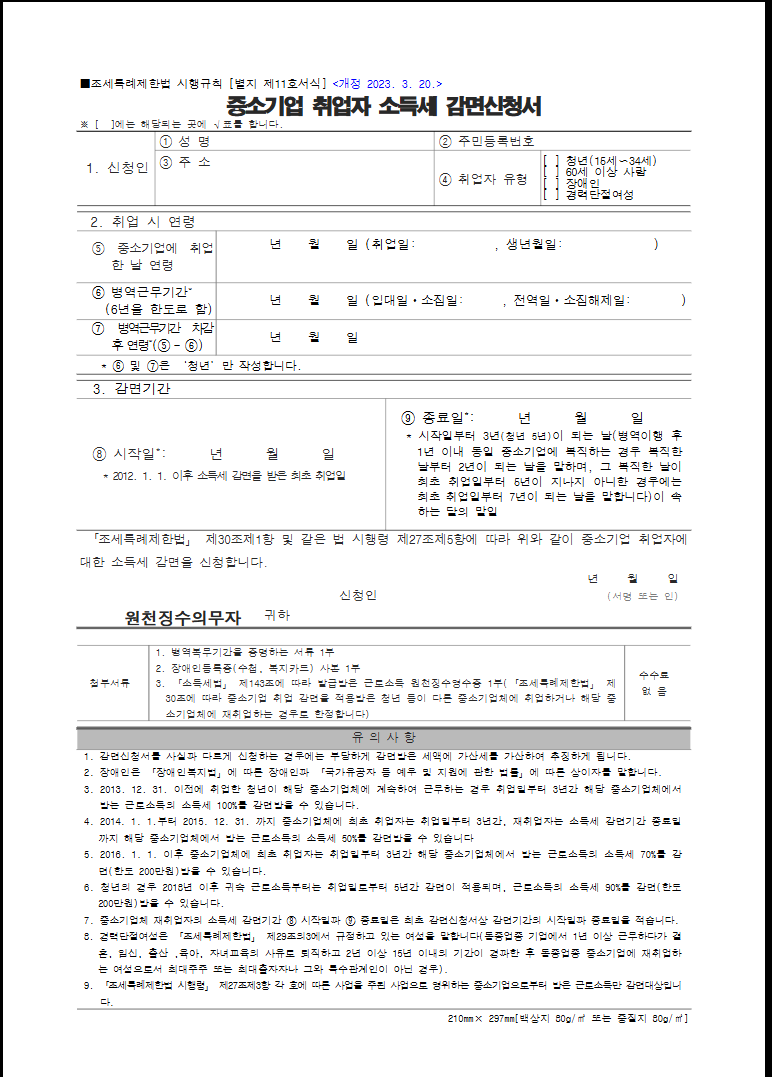 중소기업 취업자 소득세 감면 신청서 다운로드 하실분은 아래 바로가기를 클릭하시면 빠르게 다운로드 가능합니다.